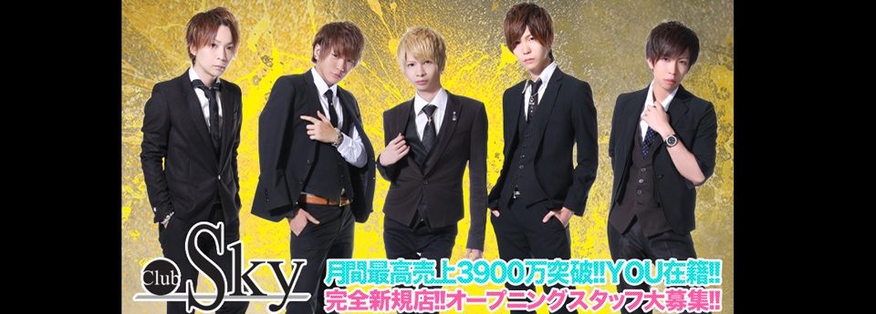 完全新規店!! 今なら体験入店の際、入店1ヶ月目の売上100%バック! 当店は、月間売上3900万円を突破した超カリスマホストYOUのお店です。 Skyは完全新規オープンの為、既に完成されたお店ではなく、 これからスタッフ全員で力を合わせて作っていくお店です。 未経験者の方も経験者の方も是非一度、面接・体験にお越し下さいませ!!